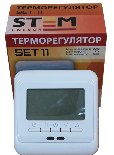 Терморегулятор для тёплого пола SET-11 мощностью 6 кВт, со встроенным датчиком температуры воздуха и выносным датчиком температуры пола. Большой графический дисплей с подсветкой и кнопками управления. Наличие встроенного меню. Встроенный монтаж. Многорежимный терморегулятор: постоянное поддержание комфортной температуры, суточный цикл, недельный цикл. Датчик пола входит в комплект.